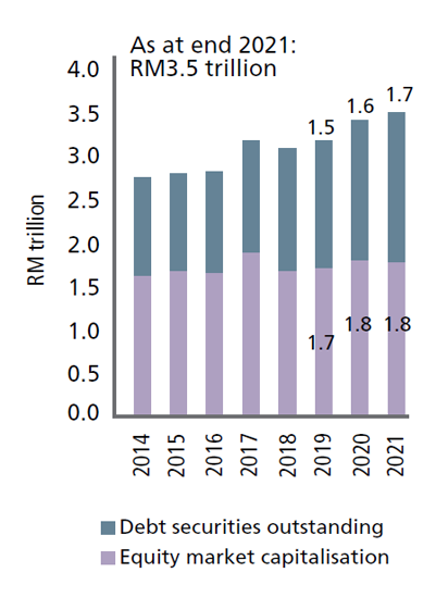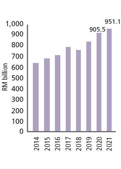 Meanwhile, alternative financing avenues2 via equity crowdfunding (ECF) and peer-to-peer financing (P2P financing) continued to gain traction, especially in supporting the funding needs of MSMEs. Likewise, the fund management industry grew further during the year, with AUM totalling RM951.1 billion (2020: RM905.5 billion). This mainly reflects increased diversification of financial assets in domestic and foreign markets, with the unit trust segment3 remaining the largest source of funds for AUM. Overall, the size of the capital market rose to RM3.5 trillion in 2021 (2020: RM3.4 trillion).