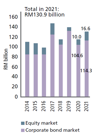 The Malaysian capital market remained resilient and orderly throughout 2021 amid the relatively challenging global and domestic environment. Importantly, it continued to serve its fundamental roles in financing the domestic economy and intermediating savings. Total funds raised in the capital market remained robust, rising to RM130.9 billion in 2021 (2020: RM114.6 billion), above the five-year pre-pandemic average of RM121.4 billion, of which RM16.6 billion was raised via the equity market1, while RM114.3 billion was raised through the corporate bond market.