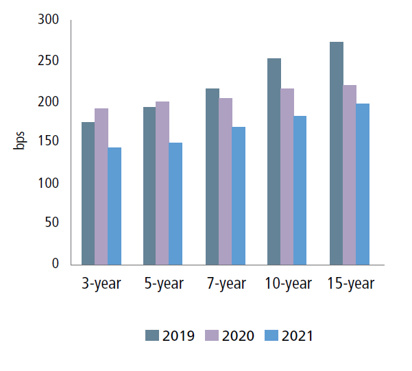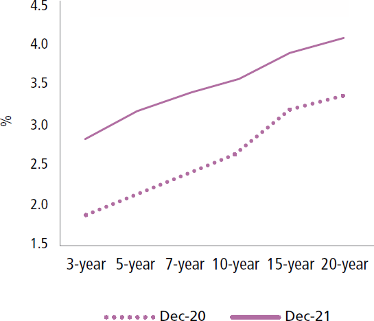 In the Malaysian bond market, total bonds outstanding grew to RM1.7 trillion in 2021 from RM1.6 trillion in 2020, reflecting higher levels of debt fundraising. The overall Malaysian Government Securities (MGS) yield curve broadly shifted upwards, led by mid-to long-term tenures, in tandem with the general increase in global bond yields amid higher global inflation expectations and the prospect of faster global monetary policy normalisation. Meanwhile, the spread between corporate bonds and MGS broadly narrowed across tenures, suggesting improved optimism on the domestic growth outlook especially towards the end of 2021. The domestic bond market also witnessed increased foreign interest, with net inflows amounting to RM33.6 billion in 2021 (2020: RM18.3 billion), the highest since 2012.