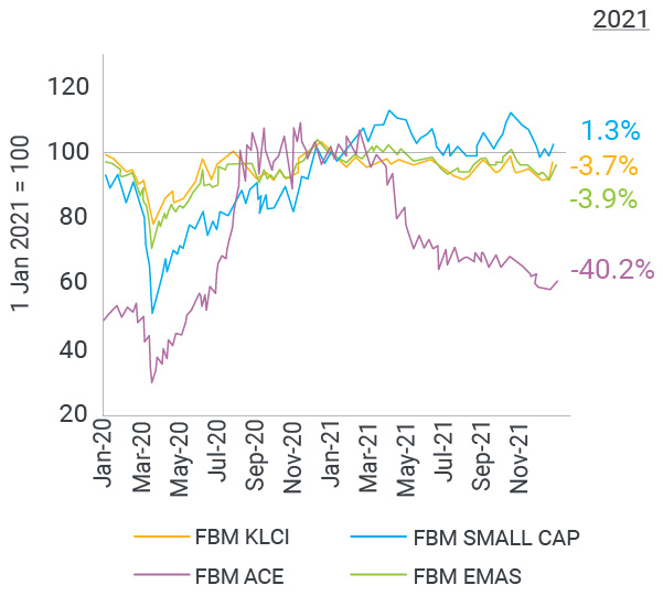 Note: * FBMKLCI consists of the largest 30 companies ranked by full market capitalisation in the FTSE Bursa Malaysia EMAS Index; FBM Small Cap consists of all constituents of the FTSE Bursa Malaysia EMAS Index that are not constituents of the FTSE Bursa Malaysia Top 100 Index; and FBM ACE comprises all companies listed on the ACE Market.