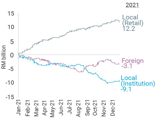 The domestic equity market was affected by continued headwinds both globally and domestically. The overall market capitalisation of Bursa Malaysia and the FBMKLCI moderated to RM1.79 trillion and RM1.04 trillion respectively in 2021 (2020: RM1.82 trillion and RM1.06 trillion respectively). Likewise, the FBMKLCI index declined by -3.7% to end the year at 1,567.5 points. Nevertheless, sentiments in the domestic equity market remained in favour of FBM Small Cap companies, given their continued outperformance during the year. In terms of trade participation, local institutions turned net sellers to a total of -RM9.1 billion in 2021, while net selling by non-residents eased to -RM3.1 billion (2020: -RM24.6 billion). Correspondingly, net buying by local retail investors rose to RM12.2 billion. The participation rate for retail investors thus was higher in 2021, rising to an average of 34.6% in terms of value traded.