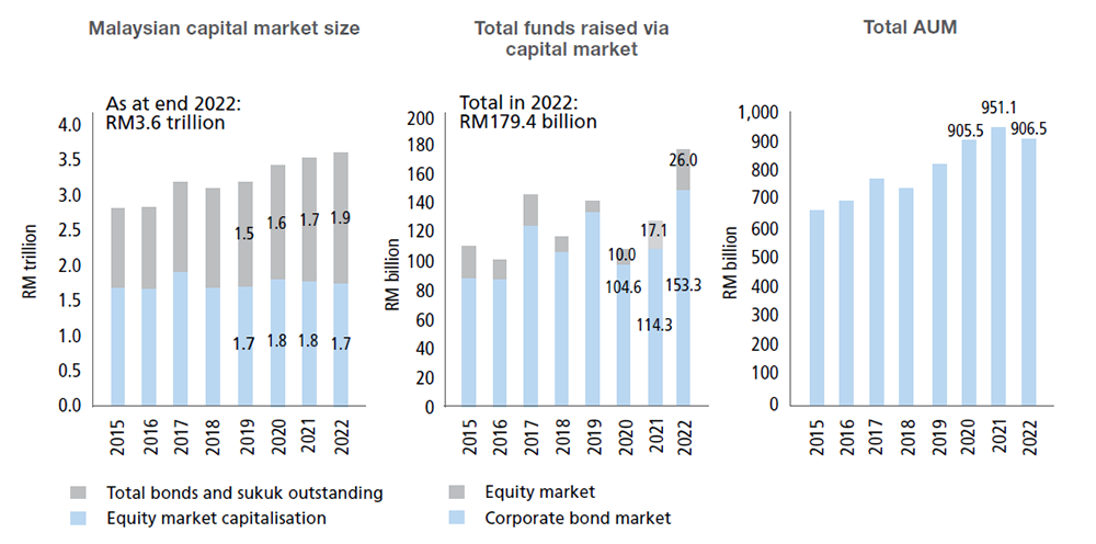 Meanwhile, the fund management industry experienced weaker market valuation and net redemptions in 2022, with AUM totalling RM906.5 billion (2021: RM951.1 billion). The unit trust segment3 remained the largest source of funds for AUM. Overall, the size of the capital market rose to RM3.6 trillion in 2022 (2021: RM3.5 trillion), as the drop in equity market capitalisation was offset by higher bonds and sukuk outstanding (Chart 4).