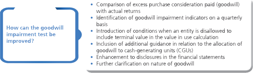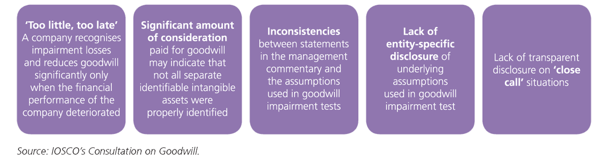 While supporting the IASB’s plan to enhance disclosure requirements on acquisition and its subsequent performance, IOSCO is of the view that goodwill impairment could be further improved. IOSCO’s observations on issues surrounding goodwill are depicted in Figure 1.