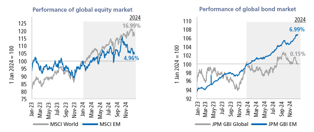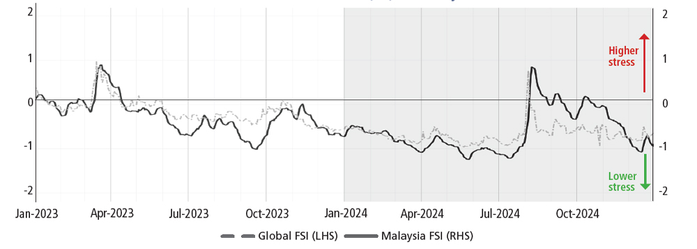 Global financial markets performance gained momentum in 2024, as investors priced in optimism over potential interest rate cuts by major central banks, while corporate earnings remained favourable. The progress of easing inflation and growth prospects across major economies shaped investors’ expectations surrounding the path of global monetary policy, which resulted in cross-border portfolio fund flows that created additional volatility to the financial market. The level of global financial stress surged in August 2024, amid recession concerns in the US and the unwinding of the yen carry trade following Bank of Japan’s unexpected move to raise its key interest rate in late July. However, financial stress moderated after a series of encouraging US economic data releases that helped to alleviate concerns of a recession, buoying the performance of the global financial markets towards the end of the year (Chart 1).