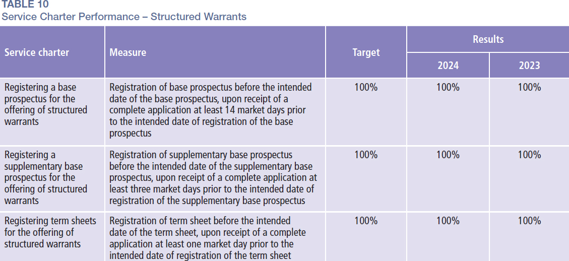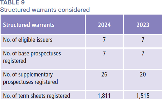 In 2024, the SC registered 1,811 term sheets for the offering of structured warrants, representing a 20% increase from 1,515 term sheets registered in 2023. Additionally, the SC registered 26 supplementary prospectuses in the same year, marking an increase of 30% compared to 2023 (Table 9). These developments underscore the structured warrants market’s growing significance within Malaysia’s capital market, providing investors with a broad spectrum of listed investment choices. Structured warrants continue to offer exposure to various underlying assets, enabling investors to capitalise on market movements with greater leverage. The structured warrants market’s sustained expansion highlights increasing investor participation, driven by growing interest in accessible and flexible trading instruments that support portfolio diversification and strategic positioning. This momentum also reflects the evolving preferences of investors, who are actively seeking higher-yield opportunities in listed markets.
