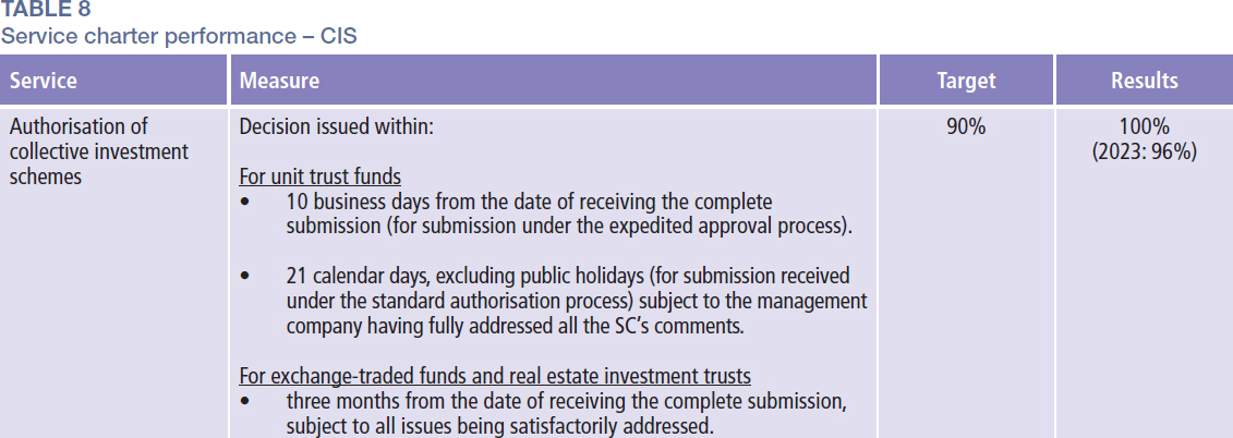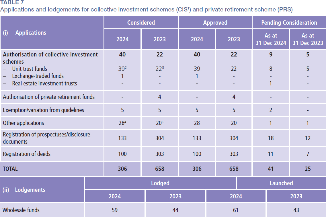 In 2024, the SC considered a total of 306 applications relating to CIS and PRS, comprising applications to establish new funds, register prospectuses and disclosure documents, register deeds and other ancillary matters. The SC also received 59 lodgements in relation to wholesale funds under the LOLA Framework for sophisticated investors.