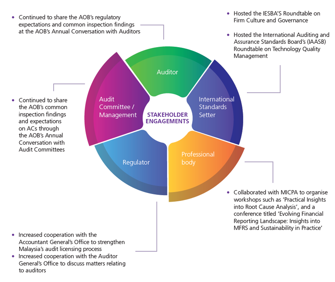 Leveraging its membership in the International Forum of Independent Audit Regulators (IFIAR) and the ASEAN Audit Regulators Group (AARG), the AOB gains access to global and regional developments while contributing to the continual enhancement of audit quality. These platforms also provide an avenue for the AOB to connect with the global and regional leadership of the six Global Public Policy Committee (GPPC) firms to discuss matters related to the network and emerging issues. The AOB’s involvement in the IFIAR working groups, including the Investor and Other Stakeholders Working Group (IOSWG) and the Sustainability Assurance Taskforce (SATF) provides the AOB with the opportunities to contribute the Malaysian perspectives to international discussions and ensuring local relevance in global standards. Participation in SATF allows the AOB to shape practices around sustainability reporting and assurance, a growing area of importance for capital markets. Through IOSWG, the AOB engages with investors and other stakeholders to better understand expectations and enhance transparency in financial reporting.