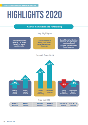 In a year marked by business disruptions, the SC was able to respond swiftly to market and commercial needs and ensure the capital market remained accessible, agile and accountable (the ‘3As’). The SC channelled its resources in 2020 to focus on deploying sustained and facilitative regulatory actions to ease evolving market pressures, manage market and operational risks, protect vulnerable investors, accelerate digitisation of the capital market and widen opportunities in key and emerging market segments.
