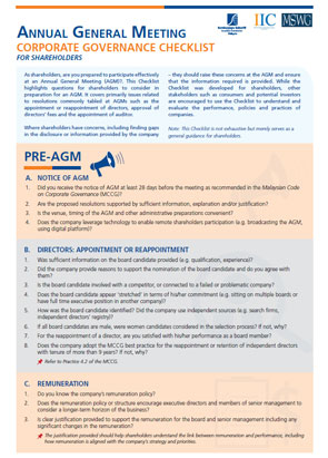 Senarai Semakan Tadbir Urus Korporat (Senarai Semakan) Mesyuarat Agung Tahunan mengemukakan soalan untuk pemegang saham sebagai persediaan untuk Mesyuarat Agung Tahunan (AGM). Pemegang saham memainkan peranan penting dalam memacu tingkah laku korporat yang bertanggungjawab. AGM adalah salah satu platform di mana mereka boleh membangkitkan isu-isu penting untuk perbincangan atau mencari penjelasan dari lembaga dan pengurusan.