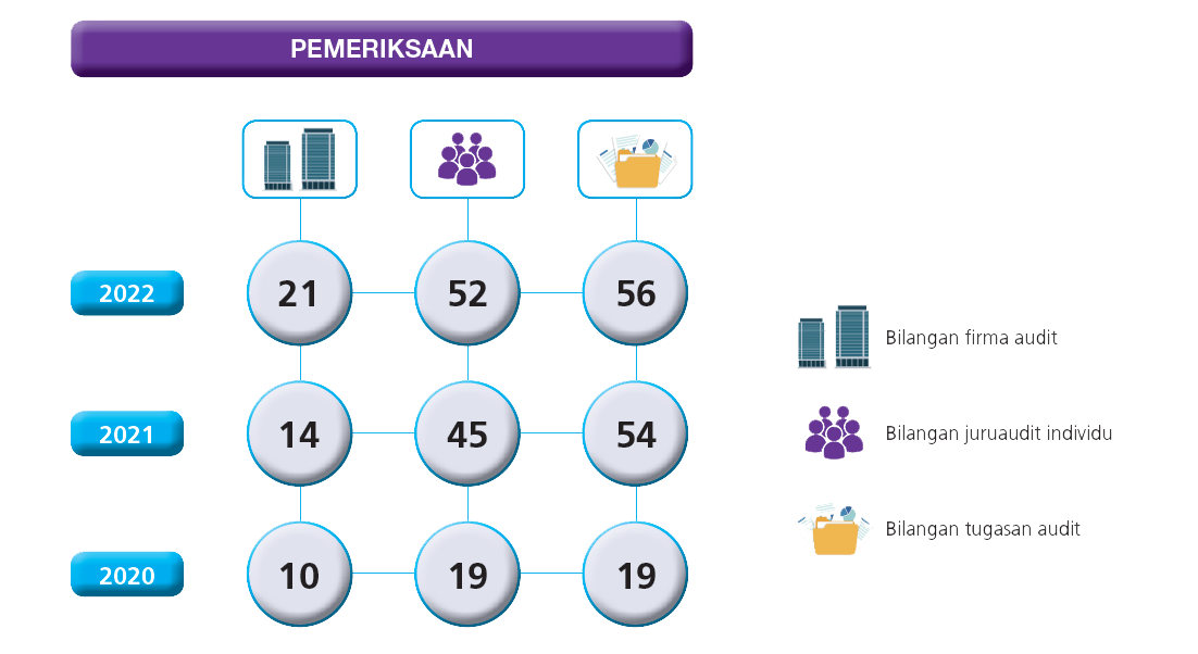 Pada 2022, AOB memeriksa 21 Firma Audit meliputi 52 juruaudit individu untuk 56 tugasan audit.
