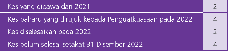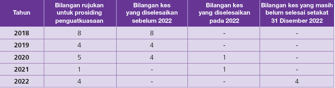 Bilangan kes yang masih belum selesai setakat 31 Disember 2022 dinyatakan dalam Jadual 3. Butiran perkembangan kes penguatkuasaan sejak 2018 dinyatakan dalam Jadual 4.