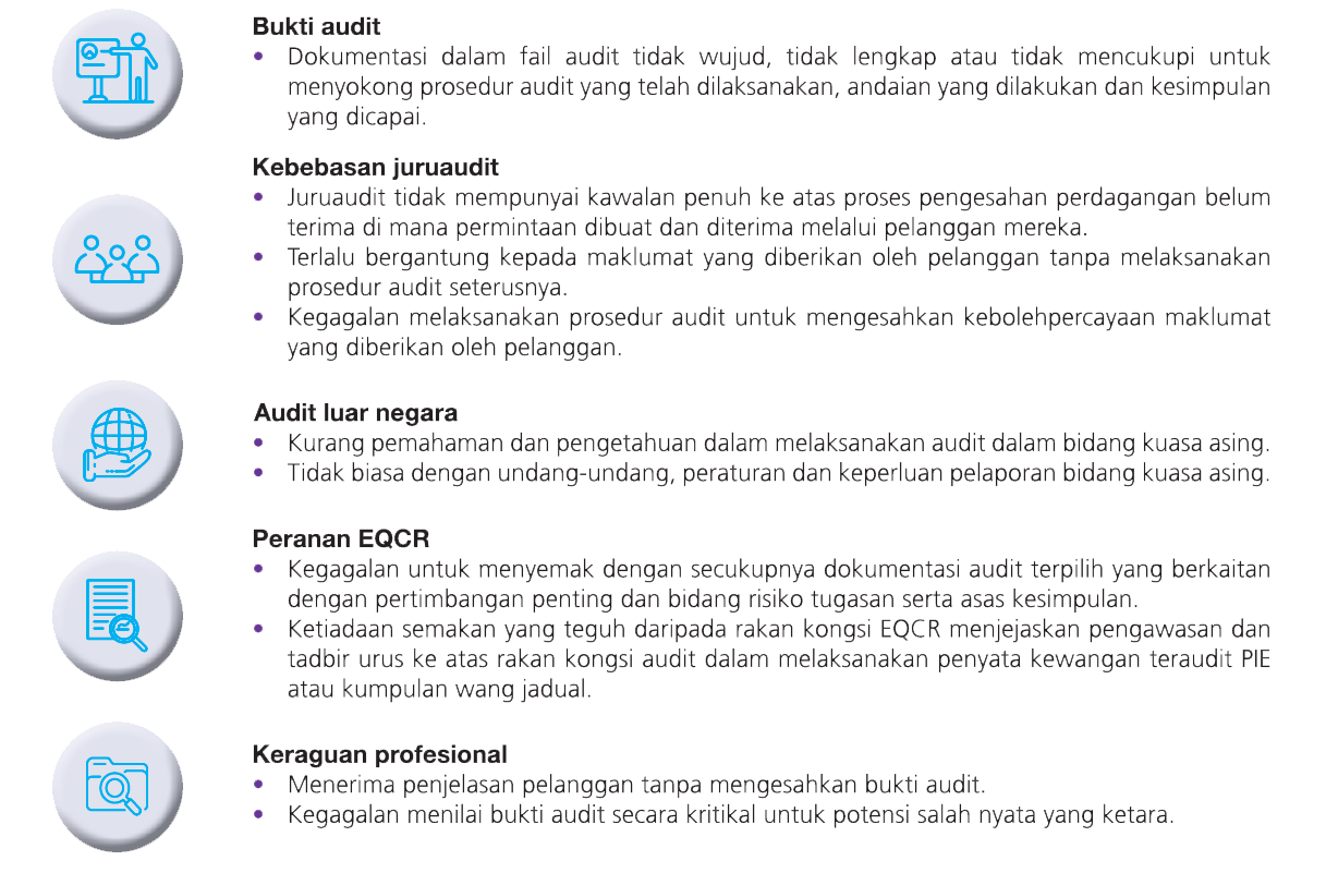 Tiga daripada rakan kongsi audit telah dikenakan sekatan kerana gagal mematuhi ISA yang berkaitan semasa melaksanakan audit PIE sebagai rakan kongsi tugasan. Sementara itu, dua lagi rakan kongsi audit dikenakan sekatan kerana gagal melaksanakan peranan mereka sebagai Penyemak Kawalan Kualiti Tugasan (EQCR). AOB memandang serius perkara ini dan menegaskan peranan penting EQCR dalam memelihara integriti kualiti audit dan proses kawalan.