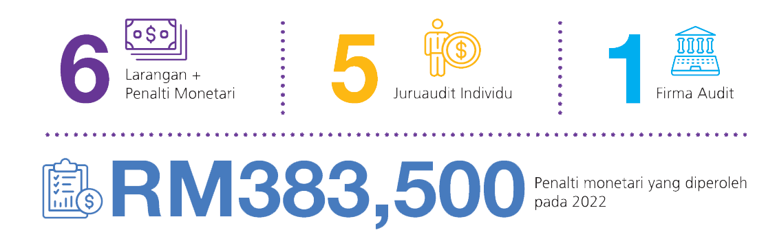 Pada tahun 2022, AOB melaksanakan enam tindakan penguatkuasaan, seperti yang ditunjukkan dalam Rajah 1. AOB melarang lima rakan kongsi audit dan satu firma audit daripada mengaudit dan menerima PIE dan kumpulan wang jadual sebagai pelanggan audit selama satu tahun. Di samping larangan tersebut, AOB juga mengenakan denda monetari ke atas rakan kongsi audit dan firma audit berjumlah RM383,500.