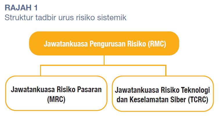 Tahun ini, SC telah mengukuhkan rangka kerja tadbir urus risiko seluruh organisasinya untuk membolehkan pendekatan yang lebih tersusun dalam mengurus risiko sistemik. Untuk meningkatkan kecekapan dan keberkesanan pemantauan risiko dan proses membuat keputusan, SC telah menyatukan dua jawatankuasa risikonya – Jawatankuasa Pemantauan Risiko Sistemik (SROC) dan Jawatankuasa Pengurusan Risiko Eksekutif (ERMC) – menjadi satu jawatankuasa yang kini dikenali sebagai Jawatankuasa Pengurusan Risiko (RMC). Mesyuarat RMC kerap diadakan untuk menangani kebimbangan risiko yang mungkin timbul daripada pelbagai segmen pasaran modal yang boleh menyumbang kepada peningkatan risiko sistemik. RMC disokong oleh Jawatankuasa Risiko Pasaran (MRC) dan Jawatankuasa Risiko Teknologi dan Keselamatan Siber (TCRC) (Rajah 1).