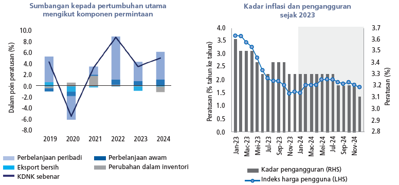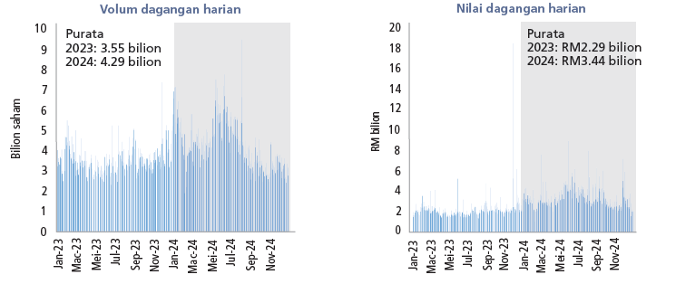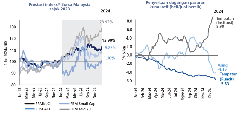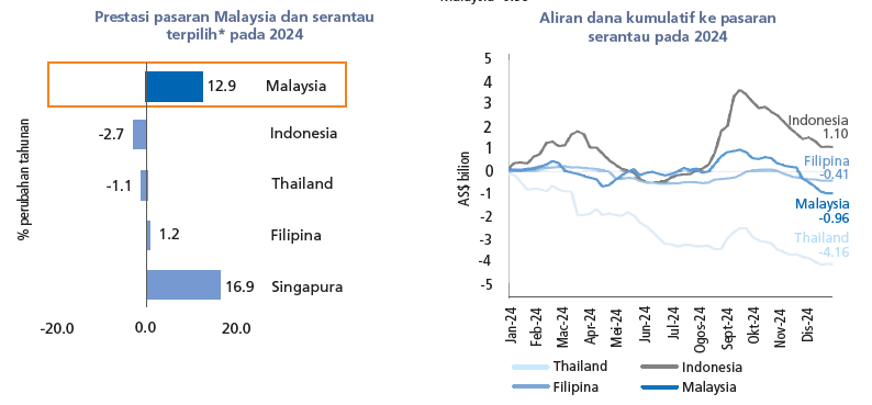 Prestasi pasaran ekuiti Malaysia sebahagian besarnya didorong oleh pelbagai faktor domestik, termasuk pelancaran dan peningkatan kejelasan dasar negara (contohnya NIMP 2030, NETR, NSS), langkah pengukuhan fiskal (contohnya rasionalisasi subsidi diesel), pertumbuhan pendapatan dan aktiviti korporat. Hal ini digalakkan oleh kedudukan Malaysia dalam rantaian nilai semikonduktor global dan peningkatan penilaian sasaran akhir FBMKLCI oleh ramai penganalisis. Selain perkembangan domestik, cabaran global terus mempengaruhi sentimen pelaburan dan peralihan modal, dengan turun naik didorong oleh ketidaktentuan hala tuju dan kadar dasar monetari global pada separuh pertama (1H) 2024, konflik geopolitik yang berterusan dan pertumbuhan ekonomi yang lebih perlahan dari China. Tahun 2024 khususnya, mencatatkan aliran keluar ekuiti asing daripada pasaran ekuiti domestik berjumlah -AS$941.9 juta pada 2024, berbanding aliran keluar bersih sebanyak -AS$514.2 juta pada 2023.