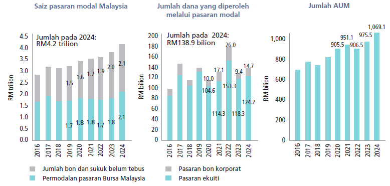Jumlah dana yang diperoleh dalam pasaran modal meningkat kepada RM138.9 bilion pada 2024 (2023: RM127.7 bilion), dengan RM14.7 bilion diperoleh