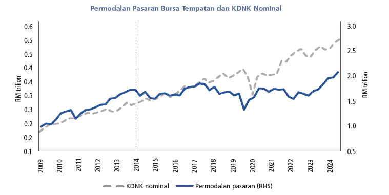 kepada RM1.2 trilion (2023: RM1.0 trilion). Indeks penanda aras FBMKLCI mengatasi prestasi pasaran global dan serantau (MSCI Asia Pasifik: 7.23%, MSCI ASEAN: 7.67%), meningkat 12.90% (2023: -2.73%) dan ditutup pada 1,642.33 mata pada penghujung tahun 2024. Sementara itu, FBM Mid 70 dan FBM Small Cap meningkat sebanyak 28.93% dan 9.85% (2023: 12.28% dan 9.57%) kepada masing-masing 18,841.13 mata dan 17,963.66 mata, memaparkan anjakan positif dalam sentimen yang memihak kepada syarikat bersaiz sederhana dan kecil, seperti yang dicerminkan oleh prestasi menggalakkan FBM Mid 70 dan FBM Small Cap (Carta 6). Dalam kalangan rakan ASEAN-5, terutamanya, FBMKLCI mengatasi kebanyakkan prestasi rakan setaranya walaupun mencatat aliran keluar bersih dana (Carta 7). Pertumbuhan dalam permodalan pasaran ekuiti bagi tahun tersebut adalah menggalakkan, seiring dengan peningkatan dalam pertumbuhan KDNK. Perbezaan dalam saiz pasaran modal dan KDNK terus wujud, namun demikian, pasaran modal telah mencapai kemajuan besar untuk merapatkan jurang dalam tempoh dua tahun yang lalu (Carta 5).