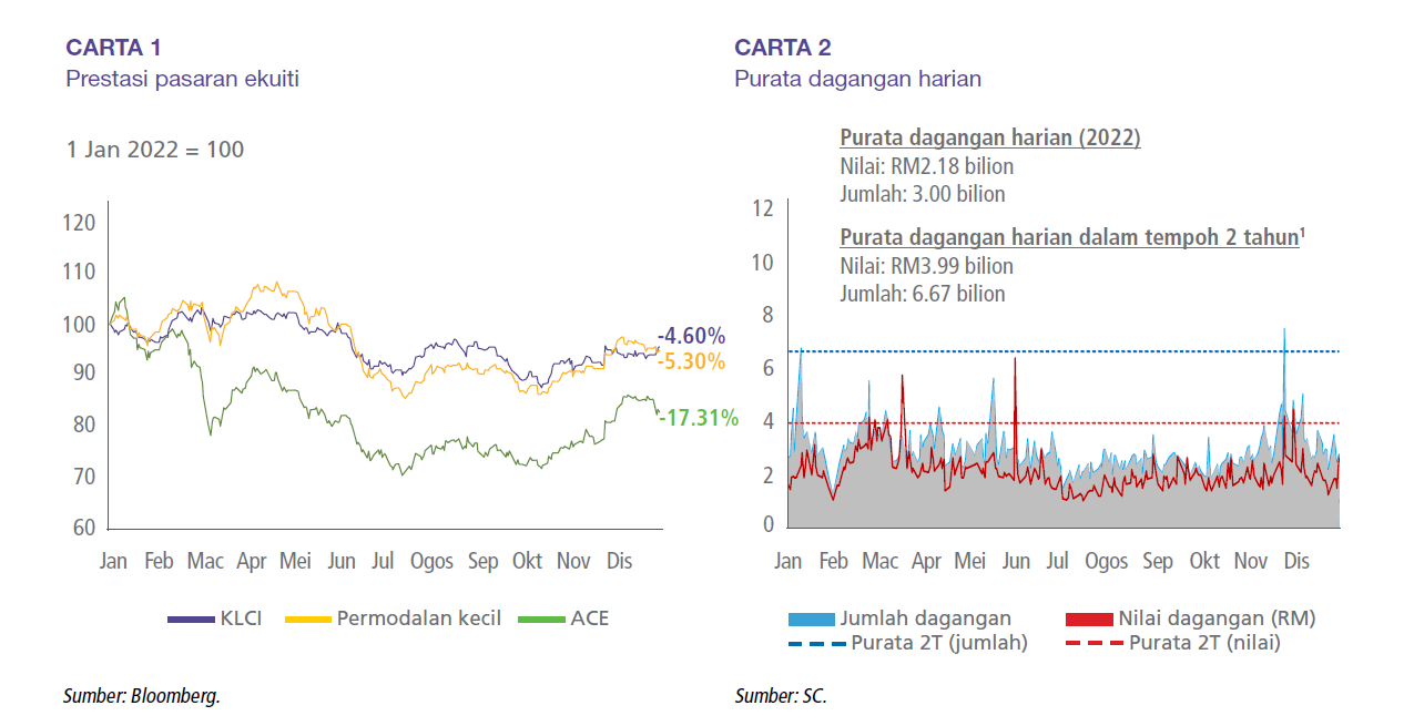 Tekanan inflasi global yang lebih tinggi, prospek pasaran ekuiti global yang lemah dan dasar monetari yang semakin ketat menjejaskan sentimen pasaran di tengah tengah penyertaan pelabur runcit tempatan dan asing yang positif pada 2022.