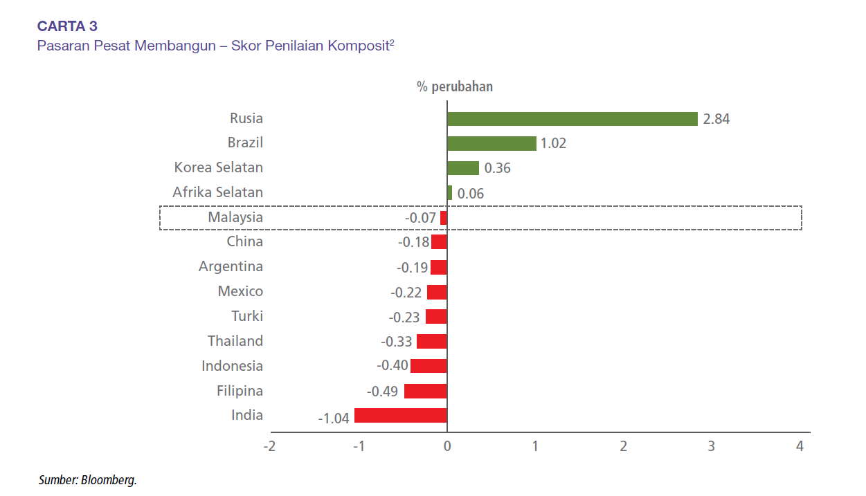 Penilaian FBMKLCI bertambah baik sedikit berbanding dengan kebanyakan pasaran pesat membangun serantau (Carta 3), di tengah-tengah jangkaan momentum pemulihan ekonomi yang lebih kukuh.