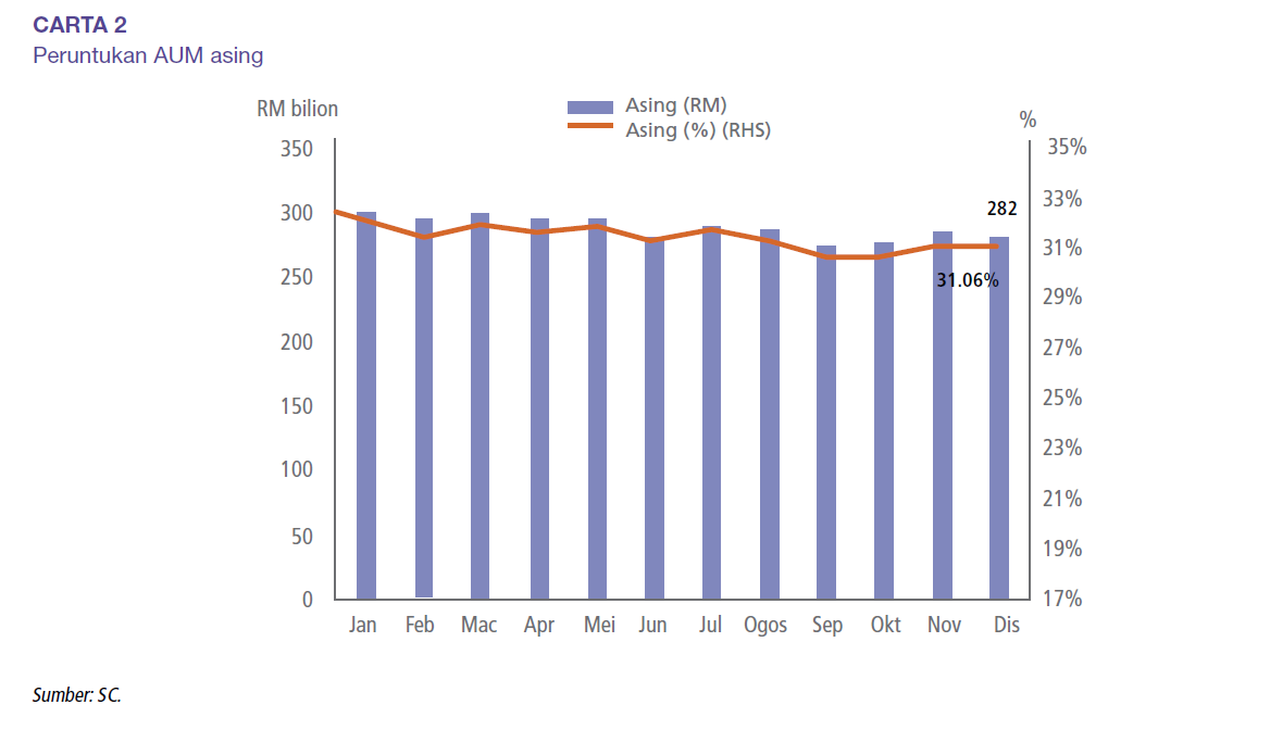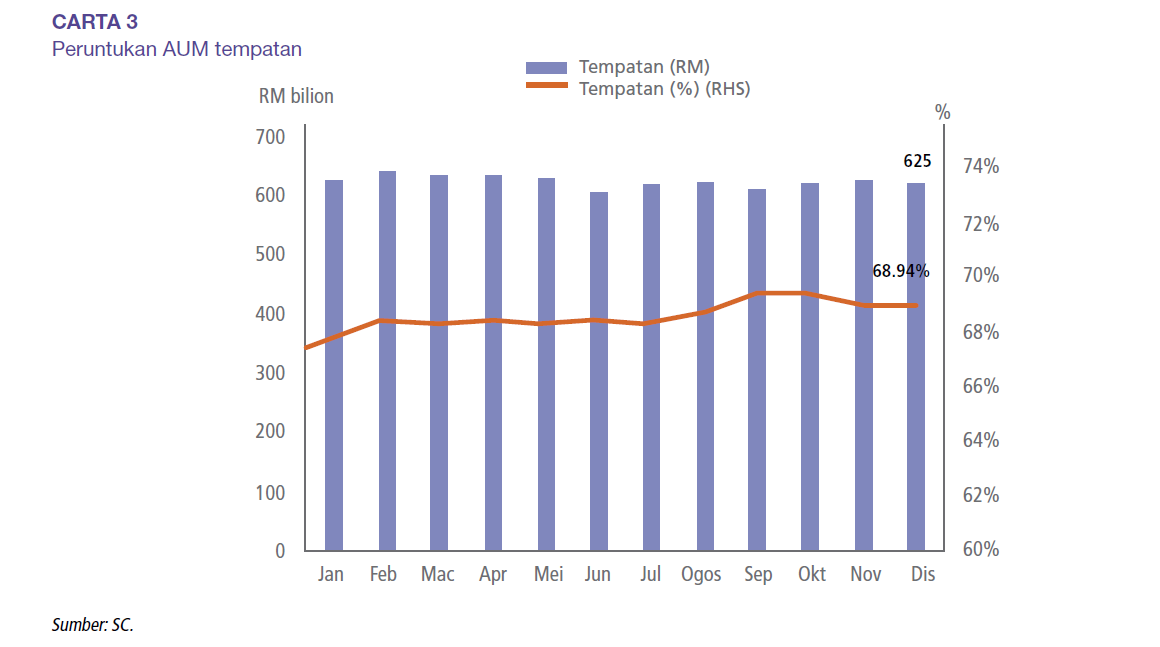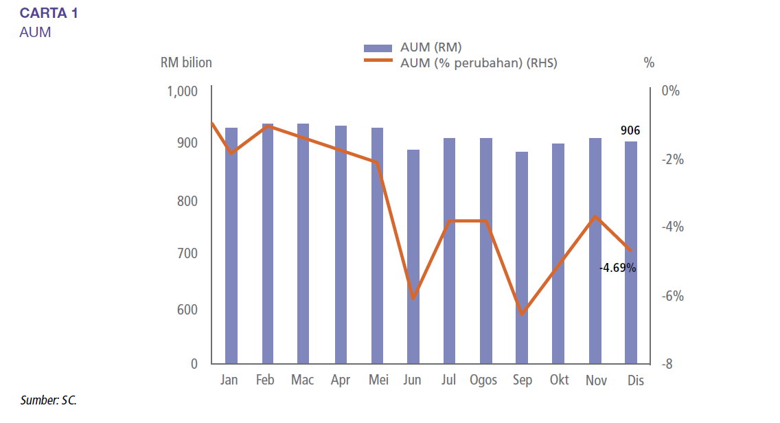 AUM industri pengurusan dana berjumlah RM906.46 bilion pada akhir Disember 2022 (Carta 1), mencatatkan penurunan sebanyak -RM44.59 bilion, atau -4.69% daripada AUM 2021 sebanyak RM951.05 bilion. Sebahagian besar ini disebabkan penurunan dalam nilai pasaran aset selari dengan pasaran global yang lemah, dimana peruntukkan utamanya adalah di dalam ekuiti (47.59%, 2021: 49.20%), diikuti oleh sekuriti pendapatan tetap (23.25%, 2021: 22.05%) dan pasaran wang (14.81%, 2021: 15.40%).