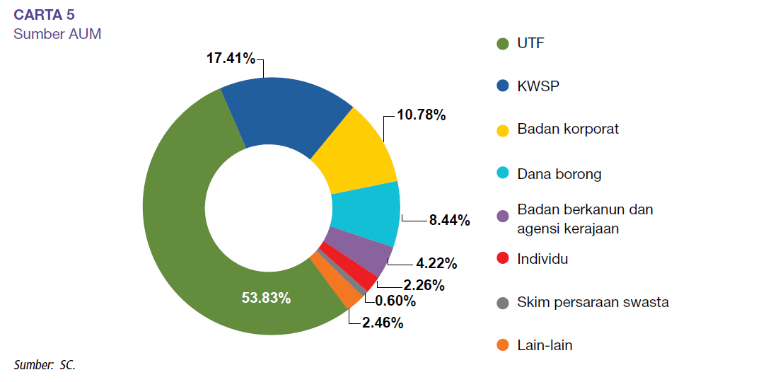 UTF kekal sebagai sumber AUM terbesar pada 53.83% (2021: 55.40%), diikuti Kumpulan Wang Simpanan Pekerja (KWSP) di 17.41% (2021: 17.34%) dan badan korporat pada 10.78% (2021: 9.97%) (Carta 5).