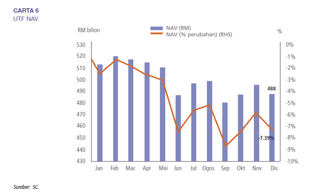 NAV UTF bernilai RM487.94 bilion pada Disember 2022 (Carta 6), mencatatkan penurunan daripada RM526.90 bilion pada Disember 2021. Penurunan ini disebabkan oleh kemerosotan dalam nilai aset, konsisten dengan pasaran ekuiti yang lemah dan keseluruhan pergerakan AUM.