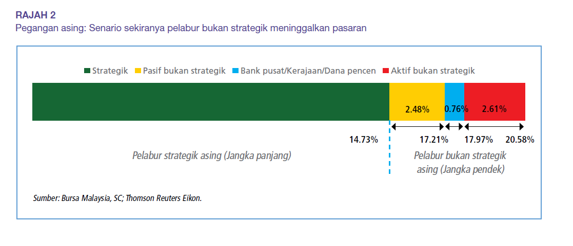 Terdapat tiga senario hipotetikal untuk mensimulasikan pegangan saham asing jika pelabur bukan strategik keluar daripada pasaran ekuiti domestik. Rajah 2 menunjukkan pelabur asing disusun mengikut kebarangkalian mereka untuk keluar daripada pasaran sekiranya berlaku kejutan, dengan kemungkinan paling kecil di sebelah kiri paling jauh, dan kemungkinan besar di paling kanan. Sekiranya pelabur bukan strategik aktif tidak termasuk bank pusat, kerajaan dan dana pencen melupuskan pegangan mereka, baki pegangan asing dianggarkan sekitar 17.97% (aliran keluar -RM50.95 bilion), turun daripada 20.58%. Seterusnya, jika semua pelabur bukan strategik aktif melupuskan pegangan mereka, pegangan asing akan berkurangan kepada anggaran 17.21% (aliran keluar -RM65.19 bilion).