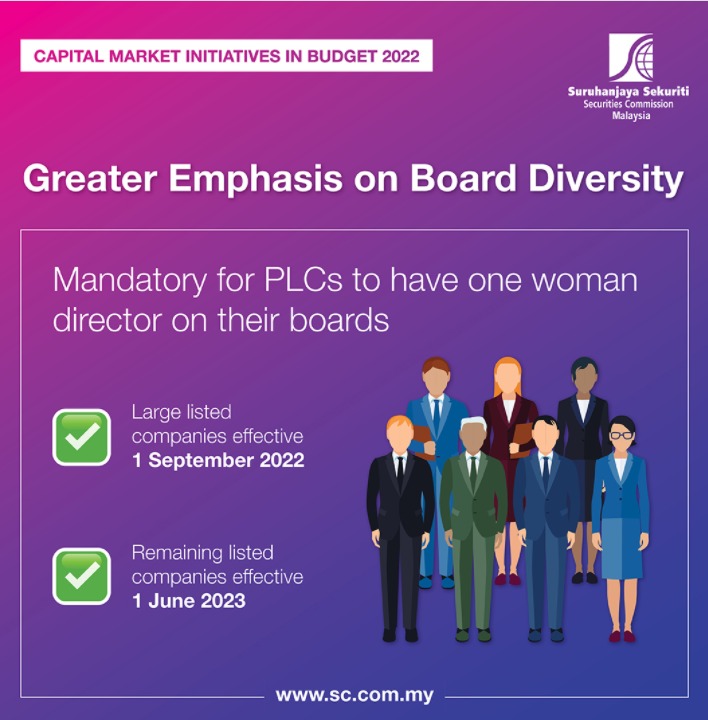 Mandatory requirement for boards of all public listed companies (PLCs) to have at least one woman director on their boards.