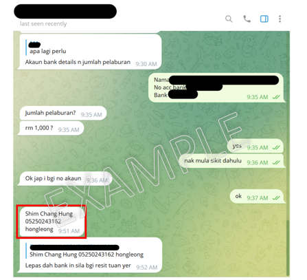 Sekiranya anda memindahkan wang ke akaun bank milik individu / entiti yang tidak berkaitan dengan entiti yang berlesen / berdaftar, anda berkemungkinan telah memindahkan wang ke akaun bank keldai.