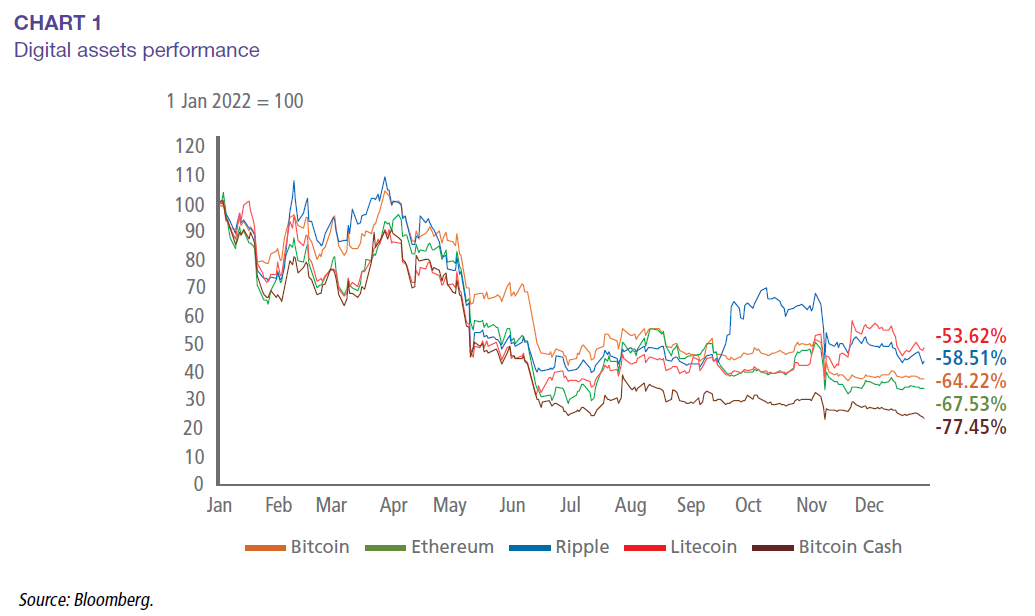 In 2022, the cryptocurrency market was hit by a crypto winter which saw a significant decline in major cryptocurrency prices. Consequently, most tracked digital assets traded on local DAXs recorded negative performances (Chart 1) as recessionary fears and geopolitical tensions sapped demand for high-risk cryptocurrency assets.