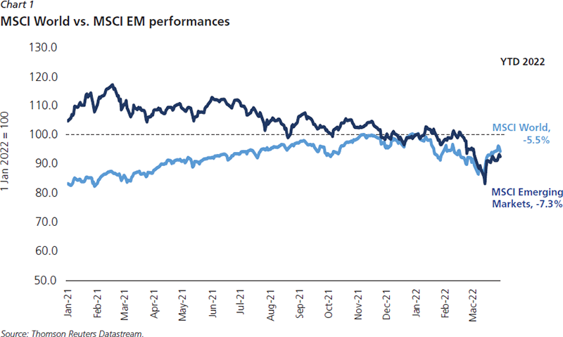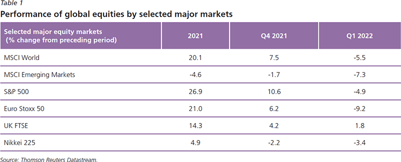 In global equities, the MSCI World declined by -5.5% q-o-q in Q1 2022 (Q4 2021: 7.5%), weighed by intensified Ukraine-Russia conflicts, soaring inflation, and the US Federal Reserve’s (Fed) increasingly hawkish pivot. Likewise, the MSCI Emerging Markets ended the quarter lower by -7.3% q-o-q (quarter-on-quarter) (Q4 2021: -1.7%), on worries of a slowdown in China’s economy, and potential spillovers from the conflict in Ukraine. In the US, the S&P 500 index fell by -4.9% q-o-q in Q1 2022 (Q4 2021: 10.6%), with initial gains tempered by the onset of the war. Similarly, the Euro Stoxx 50 declined by -9.2% q-o-q (Q4 2021: 6.2%) amid fears of an energy shortage in Europe due to the Russia-Ukraine conflict. Nevertheless, the UK FTSE 100 was resilient, rising by 1.8% q-o-q (Q4 2021: 4.2%). In Asia, the Nikkei 225 declined by -3.4% q-o-q in Q1 2022 (Q4 2021: -2.2%).