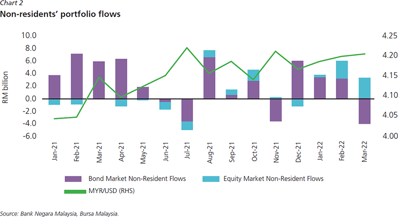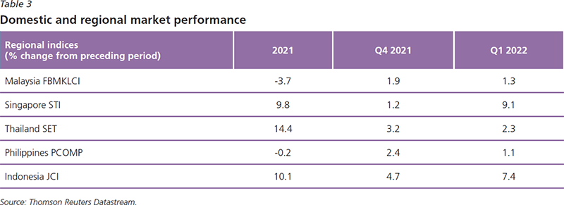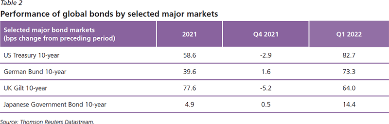 Meanwhile, global bond yields were significantly higher during the quarter as higher-than-expected inflation continued to fuel expectations of faster global monetary policy normalisation. Yields of major government bonds, led by the US Treasury (UST), rose after the Fed raised its benchmark interest rate by 25 bps to 0.50% in its Federal Open Market Committee (FOMC) meeting in March 2022, the first hike since 2018, and signalled a more aggressive cycle of rate hikes over the next 2 years. Other major central banks such as the Bank of England (BOE) and European Central Bank (ECB) also signalled faster normalisation at their latest monetary policy meetings, with the BOE hiking rates for the third time in March 2022. The UST 10-year yields increased by 82.7 bps q-o-q to 2.33%, the highest since May 2019 (Q4 2021: -2.9 bps). Likewise, the German bund 10-year yields rose by 73.3 bps q-o-q to 0.55% (Q4 2021: 1.6 bps), while the UK Gilt 10-year yields added 64.0 bps q-o-q to 1.61% in Q1 2022 (Q4 2021: -5.2 bps). In Asia, Japan’s 10-year government bond yields increased by 14.4 bps q-o-q to 0.21% (Q4 2021: 0.5 bps). Meanwhile, the EM sovereign bond yields ended broadly higher during Q1 2022.
