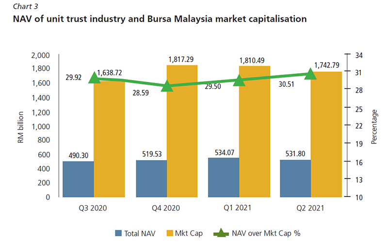 In Q2 2021, the NAV of unit trust funds decreased from RM534.07 billion as at 31 March 2021 to RM531.80 billion as at 30 June 2021. The percentage of the total NAV against Bursa Securities market capitalisation increased from 29.50% as at 31 March 2021 to 30.51% as at 30 June 2021.
