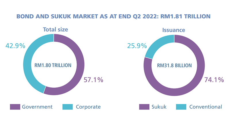 At the end of Q2 2022, the size of the Malaysian bond and sukuk market stood at RM1.81 trillion. This represented a 5.9% increase from the corresponding period in 2021. Government bonds accounted for RM1,033 billion or 57.1% of total bonds outstanding while corporate bonds constituted the remaining amount of RM777 billion or 42.9%. Total outstanding sukuk stood at RM1.14 trillion or 63% of the total bond market (Q2 2021: RM1.07 trillion).