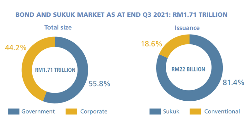 At the end of Q3 2021, the size of the Malaysian bond and sukuk market stood at RM1.71 trillion, which represented an 8.9% increase from the corresponding period in 2020. Government bonds accounted for RM956 billion or 55.8% of total bonds outstanding while corporate bonds constituted the remaining amount of RM756 billion or 44.2%. Total outstanding sukuk stood at RM1.08 trillion or 63.3% of the total bond market (Q3 2020: RM987 billion).