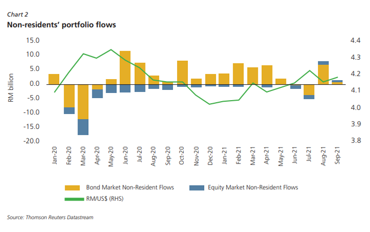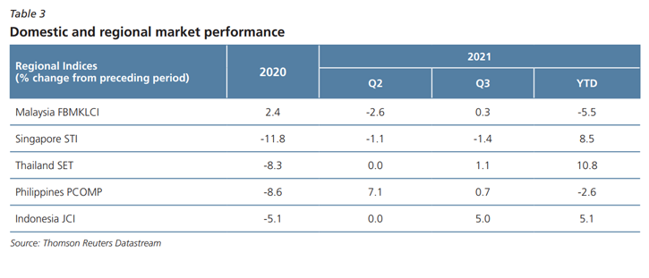Meanwhile, global bond yields were mostly higher during Q3 2021, driven by expectations of the normalisation of monetary policy by the US Federal Reserve (Fed), despite continued concern over the resilience of global economic recovery. In the latest Federal Open Market Committee (FOMC) meeting on 21-22 September 2021, the Fed signalled that it may withdraw the asset purchases programme as early as November 2021, with