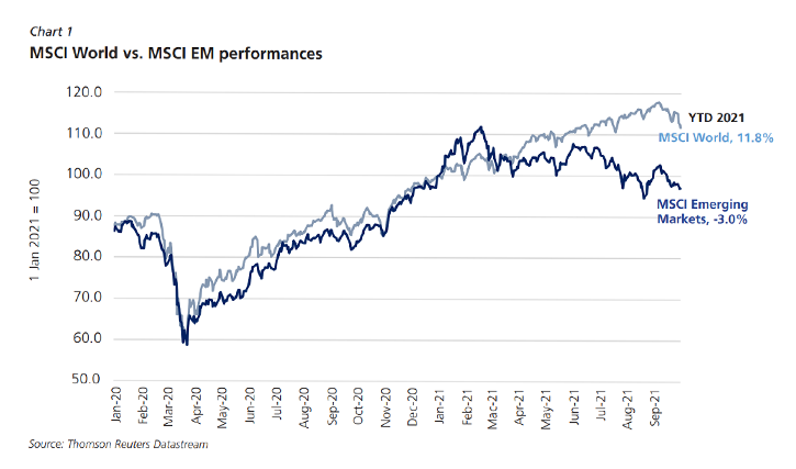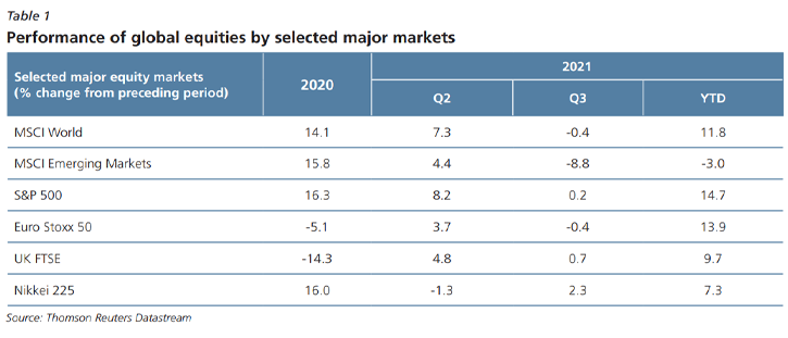 default risk. Additionally, recurrent tensions between the US and its allies against China, including increased military posturing affected investors’ sentiments. The MSCI Emerging Markets (EM) declined more, ending the period lower by -8.8% q-o-q (Q2 2021: 4.4%), weighed by the continued spread of the Delta variant against emerging economies’ continued sporadic access to vaccines and a generally weaker economic outlook. In the US, the S&P 500 index initially touched multiple record highs on continued positive economic prospects before moderating to end marginally higher by 0.2% q-o-q (Q2 2021: 8.2%). Similarly, the UK FTSE and Nikkei 225 rose 0.7% q-o-q and 2.3% q-o-q respectively (Q2 2021: 4.8% and -1.3% respectively). In contrast, the Euro STOXX 50 reversed its position from Q2 2021, declining -0.4% q-o-q in Q3 2021 (Q2 2021: 3.7%) with ongoing concerns over supply-chain bottlenecks and heightened inflationary fears.