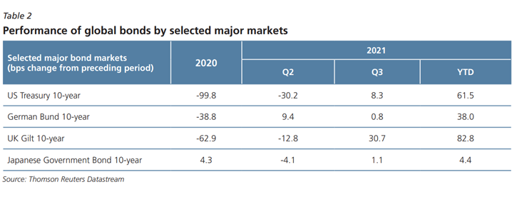 increasing inclination to raise interest rates in 2022. Meanwhile, other major central banks such as the European Central Bank (ECB), Bank of England (BOE) and Bank of Japan (BOJ) have retained their ultra-low interest rate policies during Q3 2021. The US Treasury 10-year yields rose to a three-month high of 1.54%, before ending the period up by 8.3 basis points (bps) q-o-q to 1.53% (Q2 2021: -30.2 bps). Likewise, the UK Gilt 10-year yields and the German bund 10-year yields rose by 30.7 bps q-o-q to 1.02%, and 0.8 bps q-o-q to -0.20% respectively (Q2 2021: -12.8 bps and 9.4 bps respectively), driven by higher inflation expectations. In Asia,