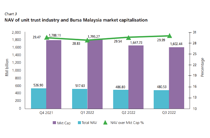 In Q3 2022, the NAV of unit trust funds decreased from RM486.80 billion as at 30 June 2022 to RM480.53 billion as at 30 September 2022. The percentage of the total NAV against Bursa Securities market capitalisation has increased from 29.54% as at 30 June 2022 to 29.99% as at 30 September 2022.