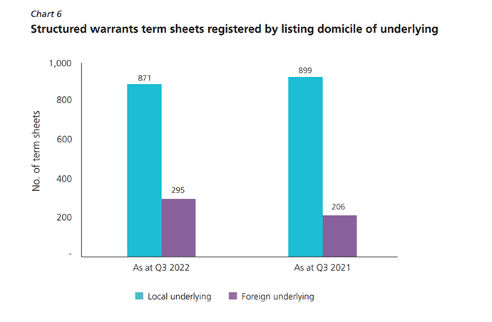 The SC registered 5 base prospectus, 18 supplementary base prospectus and 1,166 term sheets as at 30 September 2022. There were 7 eligible issuers of structured warrants as at end of Q3 2022 (Q3 2021: 6).