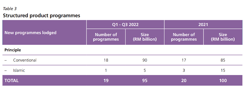 In Q3 2022, a total of 5 issuers lodged 15 new structured product programme with the SC under the LOLA Framework for unlisted capital market products. These programme comprised a variety of underlying references and had an aggregate size of RM75 billion. Table 3 below shows the details on structured product programmes as of 30 September 2022.