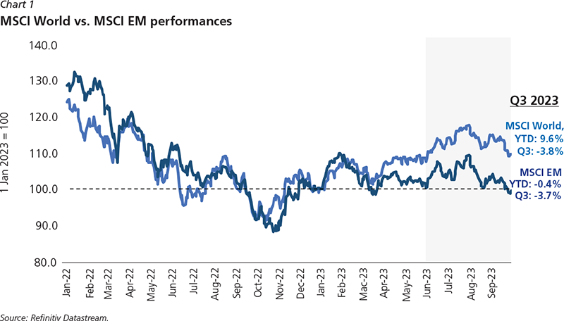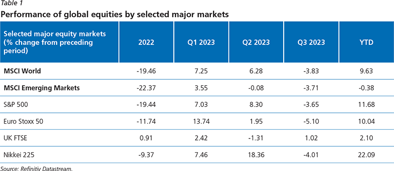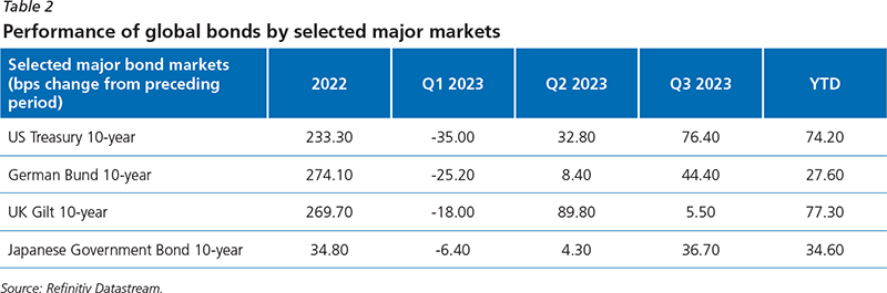 The performance of the global capital market was weaker in Q3 2023, amid the ongoing effects of tighter global monetary policy, persistent underlying inflationary pressure, ongoing geopolitical tensions, and sustained weakness in the Chinese economy. Global bond yields ended mostly higher, as major central banks signalled strong commitments to continue raising interest rates or keep them at elevated levels for a prolonged period, to restore price stability.