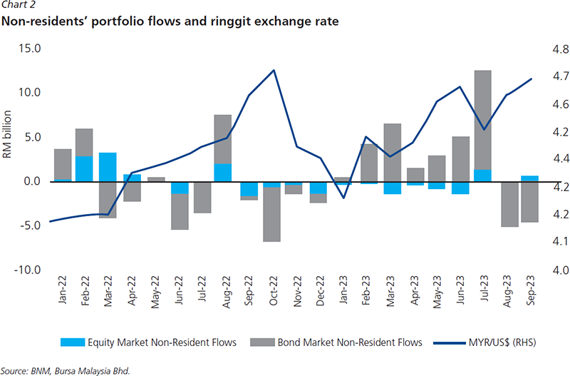 The UST 10-year yields rose by 76.40-bps q-o-q to 4.57% (Q2 2023: 3.81%), while the German Bund and UK Gilt 10-year yields increased by 44.40-bps q-o-q and 5.50-bps q-o-q to 2.84% and 4.44% respectively in Q3 2023 (Q2 2023: 2.39% and 4.39%). In Asia Pacific, the Japanese 10-year government bond yields rose by 36.70-bps q-o-q to 0.76% (Q2 2023: 0.40%). Meanwhile, EM sovereign bond yields ended similarly higher during Q3 2023, mirroring the performance of the global bond market.