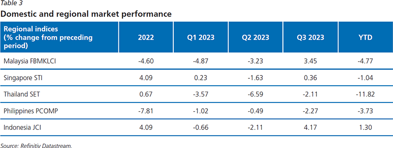 Meanwhile, global sovereign bond yields broadly increased in Q3 2023 as persistent underlying inflationary pressure prompted major central banks to strengthen their commitments to keep interest rates at elevated levels, despite slowing down their pace of monetary policy tightening. The US Federal Reserve (Fed) raised the federal funds rate by 25 basis points (bps) to 5.50% at its Federal Open Market Committee (FOMC) meeting in July 2023, but kept it unchanged at the subsequent FOMC meeting in September 2023. Similarly, the Bank of England (BOE) increased its policy rate by 25-bps to 5.25% in August 2023 and held it unchanged in September 2023. Meanwhile, the European Central Bank (ECB) raised its benchmark refinancing rate by a cumulative 50-bps to 4.5% during Q3.