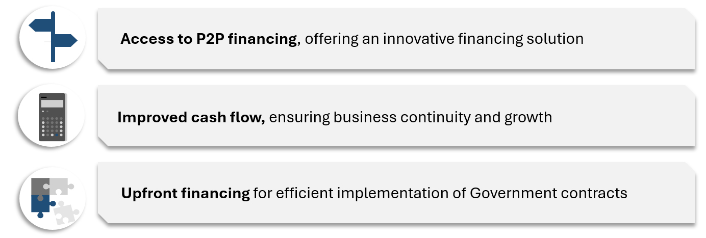 - Financing for contract implementation (pre-financing), to bridge contractors’ initial working capital needs before a project is fully executed.