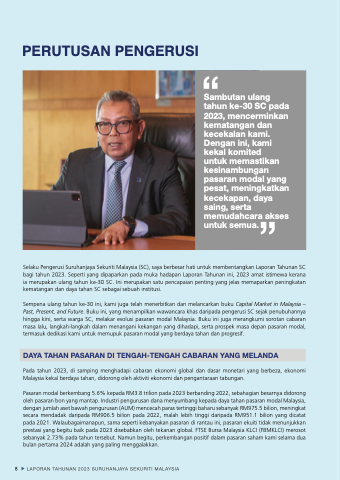 Selaku Pengerusi Suruhanjaya Sekuriti Malaysia (SC), saya berbesar hati untuk membentangkan Laporan Tahunan SC bagi tahun 2023. Seperti yang dipaparkan pada muka hadapan Laporan Tahunan ini, 2023 amat istimewa kerana ia merupakan ulang tahun ke-30 SC. Ini merupakan satu pencapaian penting yang jelas memaparkan peningkatan kematangan dan daya tahan SC sebagai sebuah institusi.