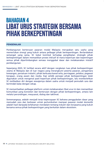 Pembangunan berterusan pasaran modal Malaysia merupakan satu usaha yang memerlukan sinergi yang kukuh antara pelbagai pihak berkepentingan. Berlandaskan semangat yang sama, SC kekal komited terhadap penglibatan strategik pihak berkepentingan dalam memastikan proses inklusif di mana keperluan dan kepentingan semua pihak dipertimbangkan semasa menggubal dasar dan melaksanakan inisiatif pembangunan.