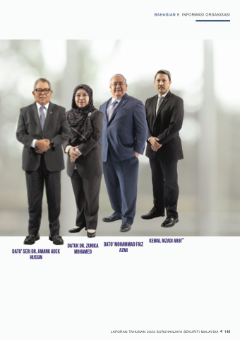DATO’ SERI DR. AWANG ADEK HUSSIN DATUK DR. ZUNIKA MOHAMED DATO’ MOHAMMAD FAIZ AZMI KEMAL RIZADI ARBI** BAHAGIAN 5 INFORMASI ORGANISASI LAPORAN TAHUNAN 2023 SURUHANJAYA SEKURITI MALAYSIA 149