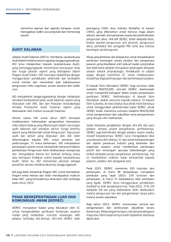 Jabatan Audit Dalaman (IAD) SC membantu Jawatankuasa Auditdalammelaksanakantugasdantanggungjawabnya. IAD terus melaporkan kepada Jawatankuasa Audit, yang bertanggungjawab menentukan kecukupan skop dan fungsi jabatan seperti yang ditetapkan dalam Piagam Audit Dalam. IAD mencapai objektifnya dengan menggunakan pendekatan sistematik dan berdisiplin untuk menilai dan menambah baik keberkesanan pengurusan risiko organisasi, proses kawalan dan tadbir urus.