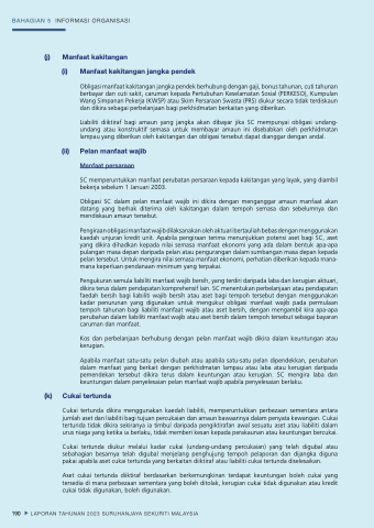 Obligasi SC dalam pelan manfaat wajib ini dikira dengan menganggar amaun manfaat akan datang yang berhak diterima oleh kakitangan dalam tempoh semasa dan sebelumnya dan mendiskaun amaun tersebut.